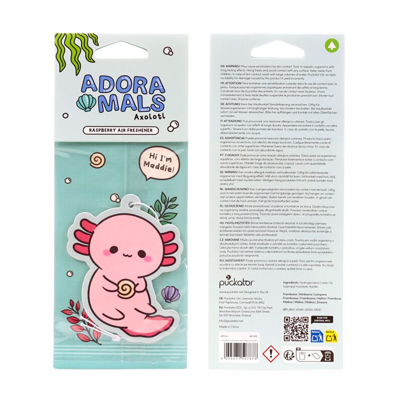 https://www.puckator.fr/airf164-desodorisant-a-suspendre-framboise-adoramals-maddie-laxolotl.htmlAIRF164Désodorisant à Suspendre Framboise - Adoramals Maddie l'Axolotl <p>Désodorisant à Suspendre Framboise - Adoramals Maddie l'Axolotl </p><p><strong>Fiche Technique:</strong></p><ul><li><strong>Composition:</strong> Carton, Polypropylene, Elastique, Papier Absorbant, et Parfum</li><li><strong>Parfum:</strong> Framboise</li><li><strong> Information Sécurité:</strong> Gardez hors de portée des enfants. Evitez de poser sur une surface, le parfum peut faire des tâches.</li><li><strong>En savoir plus?</strong> Plus de détails grâce à notre<a href="/advice-centre" target="_blank" title="Puckator FR Guide de l'acheteur"> guide de l'acheteur.</a></li></ul></p>https://www.puckator.fr/media/catalog/product/A/I/AIRF164_001_1759757928.jpg0.55outofstock0.550.5500Puckator000https://www.puckator.fr/media/catalog/product/A/I/AIRF164_001_1759757928.jpg158751587619410/Désodorisants à Suspendre/Zoo/Animaux Adoramals/De Retour En Stock/Meilleures Ventes2025-01-10T14:19:16+0000
