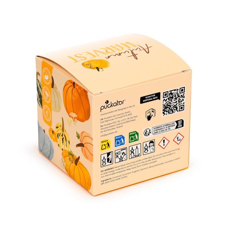 https://www.puckator.fr/cand101-bougie-cire-de-soja-dans-pot-en-verre-citrouille-epicee-recolte-dautomne.htmlCAND101Bougie cire de Soja dans pot en Verre Citrouille Epicée - Récolte d'Automne<p>Bougie cire de Soja dans pot en Verre Citrouille Epicée - Récolte d'Automne</p><p><strong>Fiche Technique:</strong></p><ul><li><strong>Composition:</strong> Verre, Liège, Cire de Soja(30%), Parafine (70%), Parfum(5%)</li><li><strong>Durée Approximative :</strong> 8 - 9 Heures</li><li><strong>Sans Cruauté:</strong> Oui</li><li><strong>Sans Huile de Palme :</strong> Oui</li><li><strong>Sans Parabene :</strong> Oui</li><li><strong>Sans SLS (Sodium Lauryl Sulphate):</strong> Oui</li><li><strong>Sans Phthalate :</strong> Oui</li><li><strong> Information Sécurité:</strong> Retirer le couvercle en liège avant usage. Ne pas remettre le couvercle quand la flamme est allumée ou fraichement éteinte. La liste complète des informations sécurité se trouve sur l'emballage</li><li><strong>En savoir plus?</strong> Plus de détails grâce à notre<a href="/advice-centre" target="_blank" title="Puckator FR Guide de l'acheteur"> guide de l'acheteur.</a></li></ul></p><p><img src="{{media url="wysiwyg/Symbols/CRUELTYFREE.jpg";}}" alt="Cruelty Free Packaging Symbol|Puckator" width="100" height="100"><img src="{{media url="wysiwyg/Symbols/SLSFREE.jpg";}}" alt="SLS Free Packaging Symbol|Puckator" width="100" height="100"><img src="{{media url="wysiwyg/Symbols/PARABENFREE.jpg";}}" alt="Paraban Free Packaging Symbol|Puckator" width="100" height="100"><img src="{{media url="wysiwyg/Symbols/PHTHALATEFREE.jpg";}}" alt="Phthalate Free Packaging Symbol|Puckator" width="100" height="100"><img src="{{media url="wysiwyg/Symbols/PALMOILFREE.jpg";}}" alt="Palm Oil Free Packaging Symbol|Puckator" width="100" height="100"></p>https://www.puckator.fr/media/catalog/product/C/A/CAND101_001_1753192420.jpg2.12instock4.242.12502.12Puckator000https://www.puckator.fr/media/catalog/product/C/A/CAND101_001_1753192420.jpg19487/Porte-Bougies & Bougies/Cadeaux Récolte d’Automne/En promo2025-06-30T14:56:19+0000